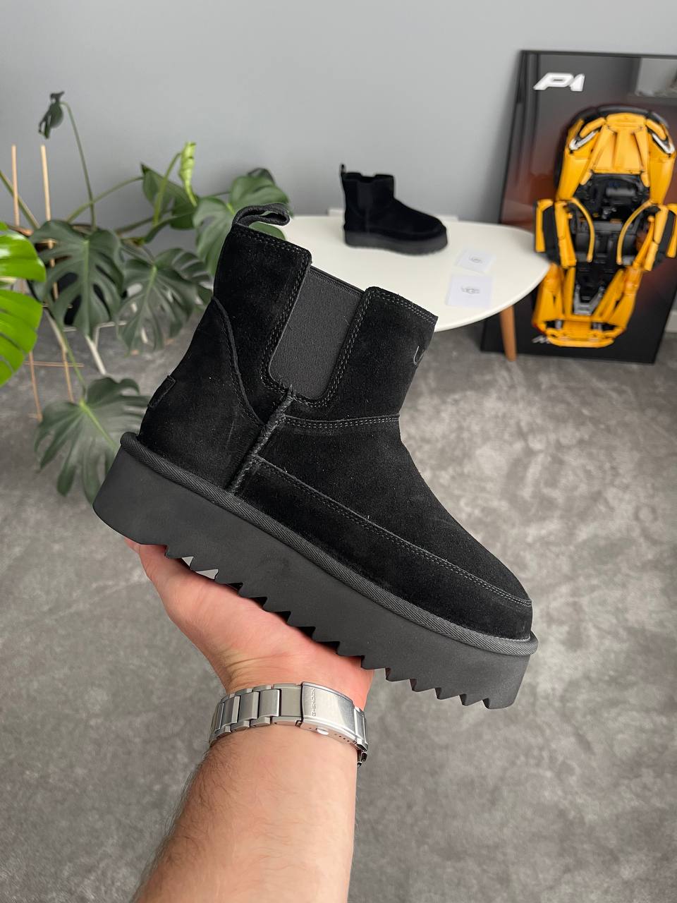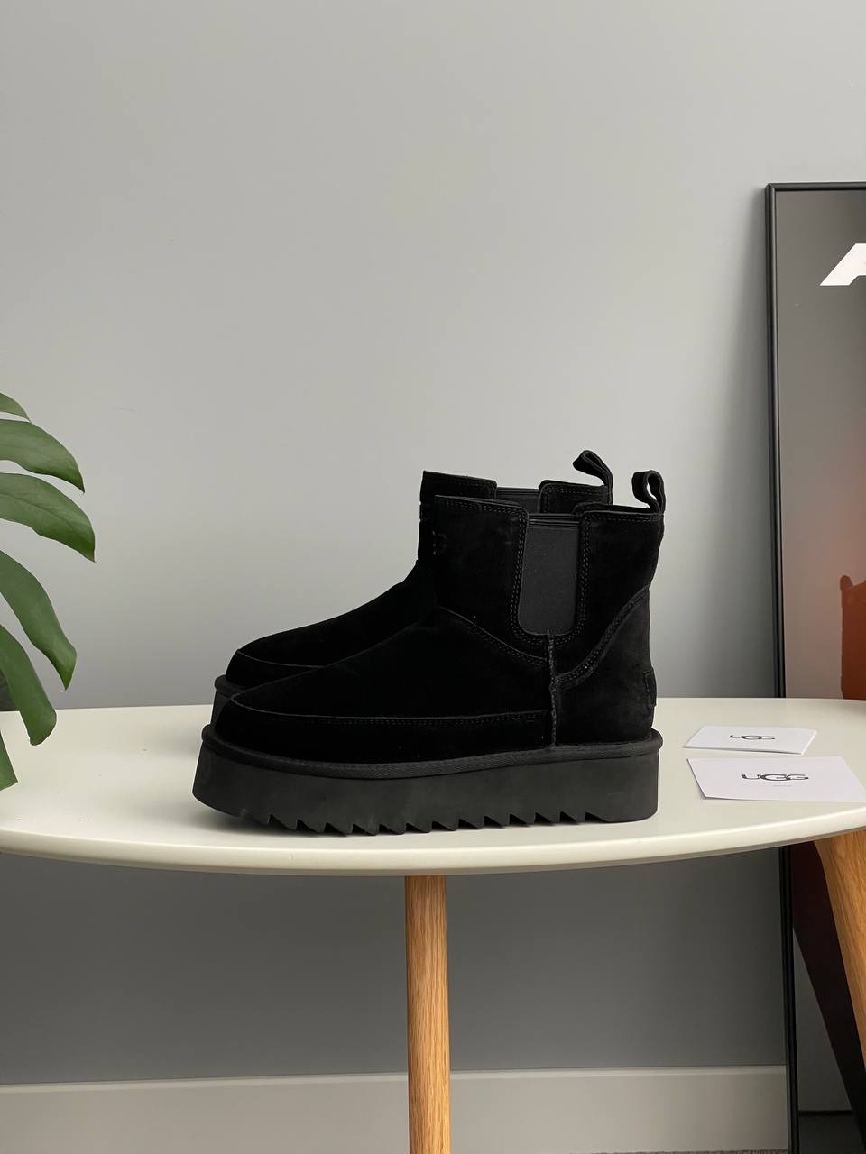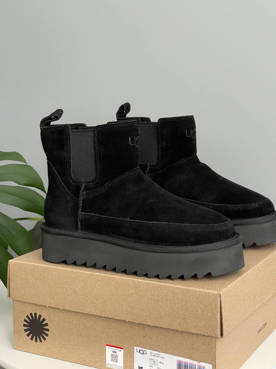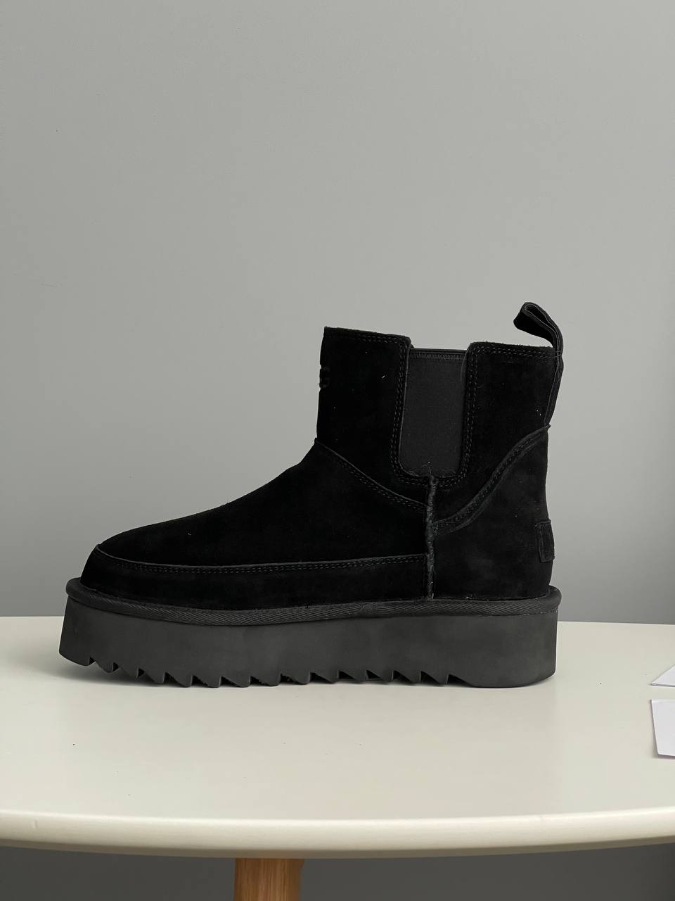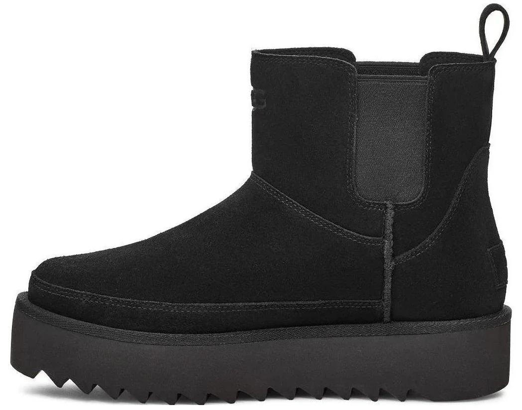 UGG Chelsea Platform Mini Boot Black — это женские ботинки, которые сочетают в себе традиционный уют и современный стиль. Модель выполнена из замши, что придает ей элегантности. Внутри ботинок мягкая подкладка из овечьей шерсти. Подошва с качественным протектором обеспечит хорошее сцепление и долговечность, делая эти ботинки надежными для повседневной носки в холодную погоду.