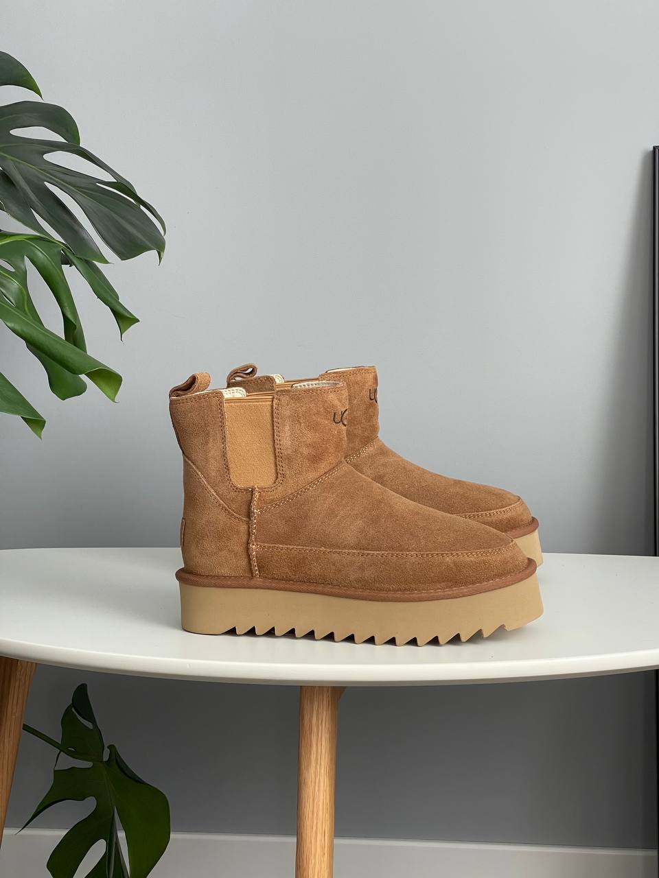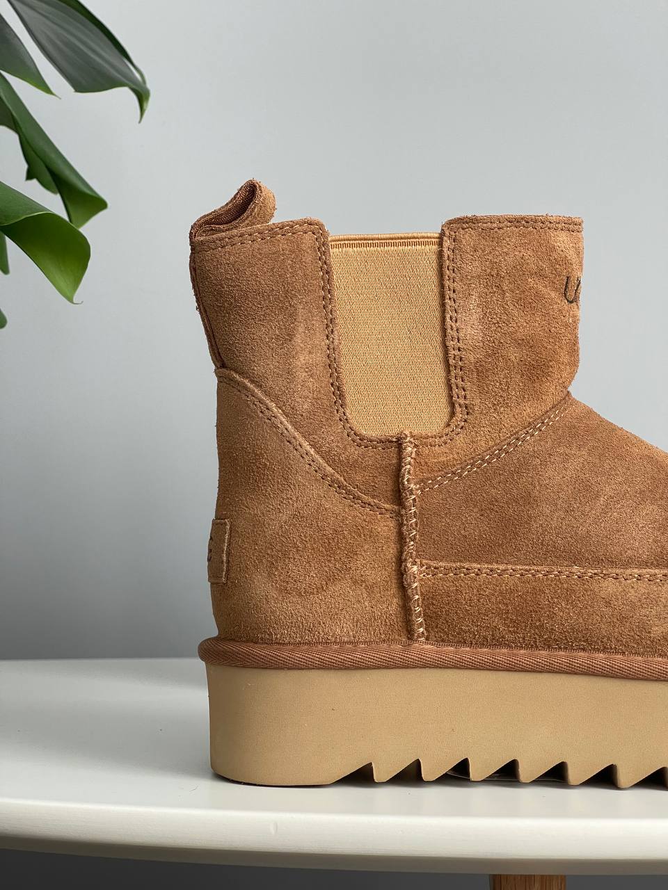 UGG Chelsea Platform Mini Boot Chestnut – це жіночі черевики, які поєднують у собі традиційний затишок та сучасний стиль. Модель виконана із замші, що надає їй елегантності. Всередині черевиків м’яка підкладка із овечої вовни. Підошва з якісним протектором забезпечить гарне зчеплення та довговічність, роблячи ці черевики надійними для повсякденного носіння в холодну погоду.
