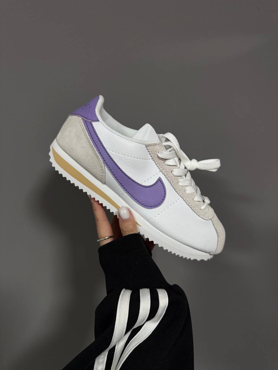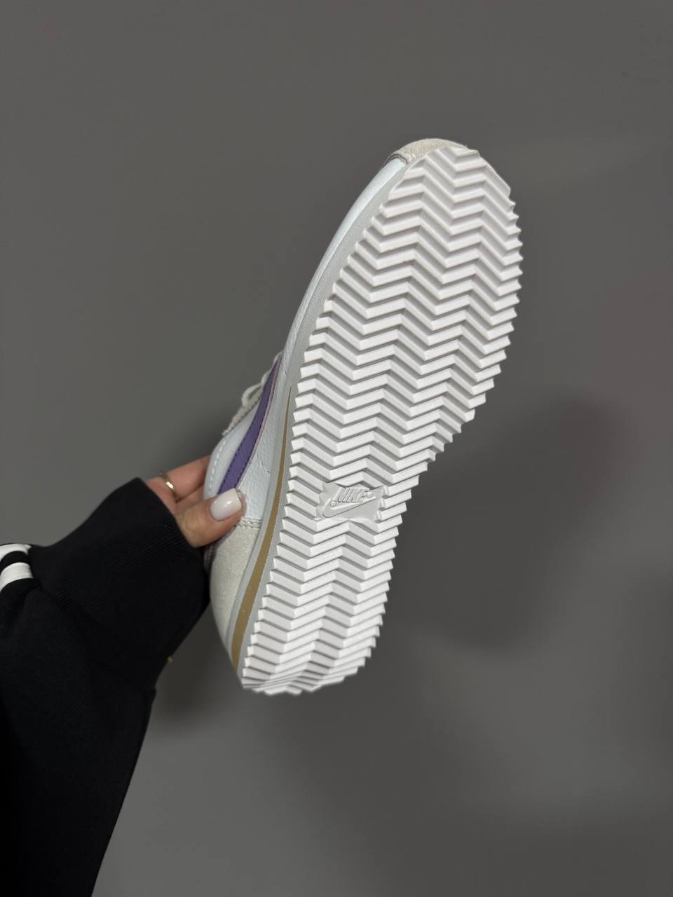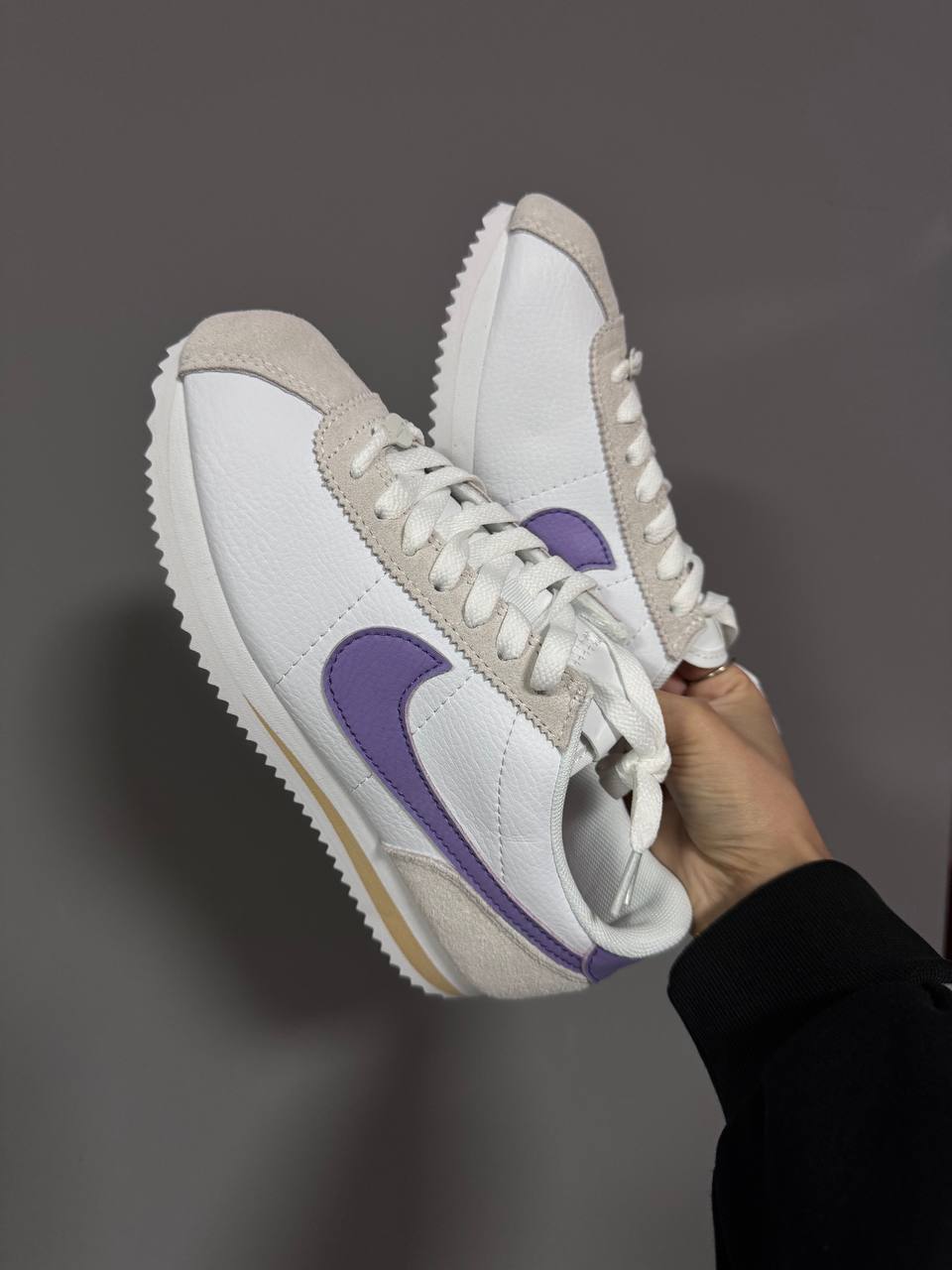 Кросівки Nike Cortez SE Sail Iced Lilac виконані у білому кольорі з фіолетовим логотипом, який привертає увагу. Верх кросівок зі шкіри, що робить їх зносостійкими та стильними на вигляд. Кросівки Кортез підійдуть під повсякденний одяг та подарують комфорт протягом усього дня.